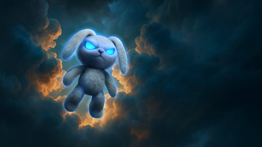 This stuffed bunny isn’t like the others. It doesn’t walk. It doesn’t hop. It simply appears — silent and sudden, as if it’s always been there. It hovers above the floor, untouched by gravity.